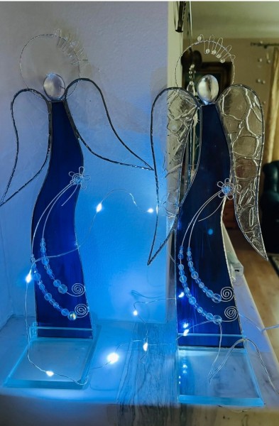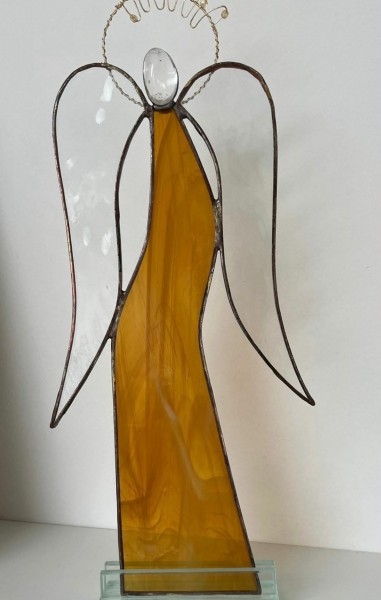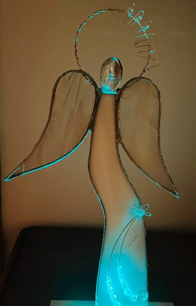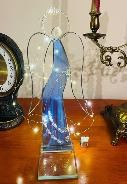 skleněný anděl s křišťálovou hlavou, dřevěný stojánek,