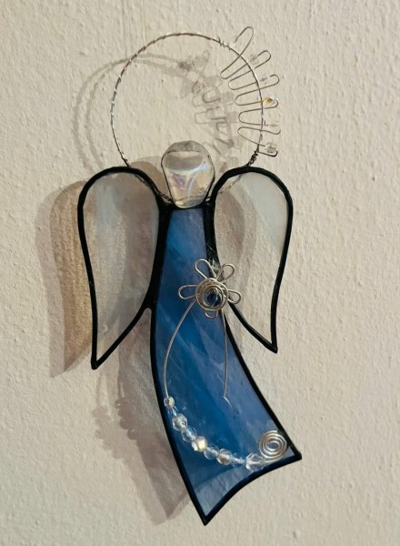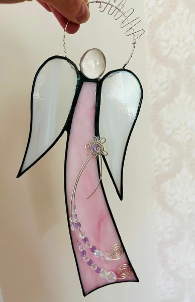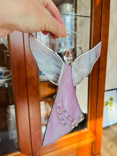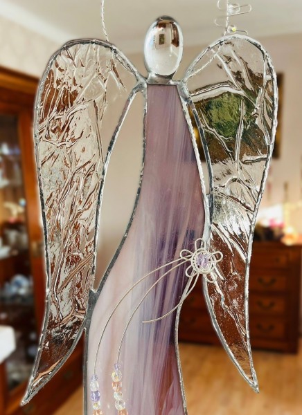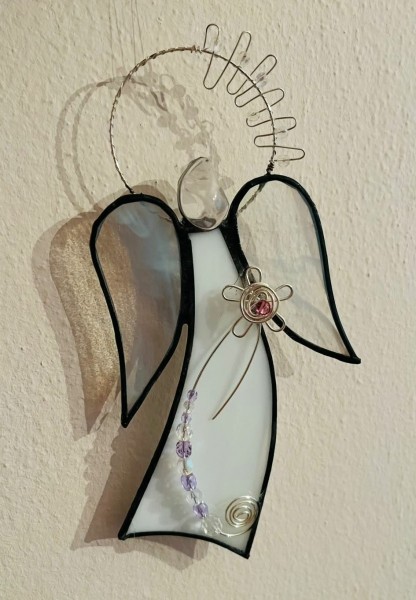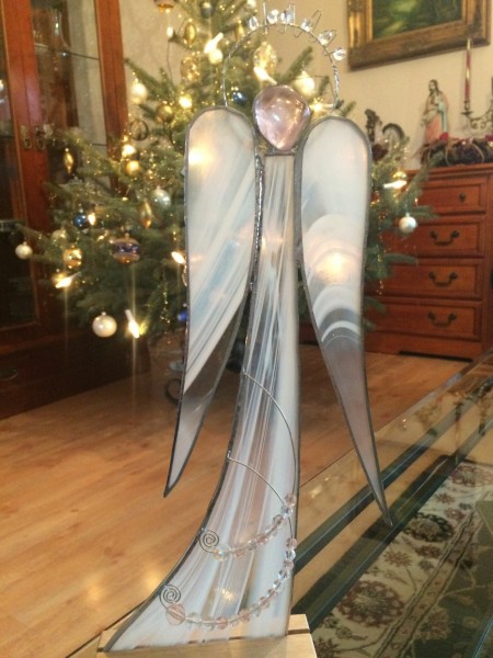 skleněný anděl s křišťálovou hlavou, skleněný stojanek,